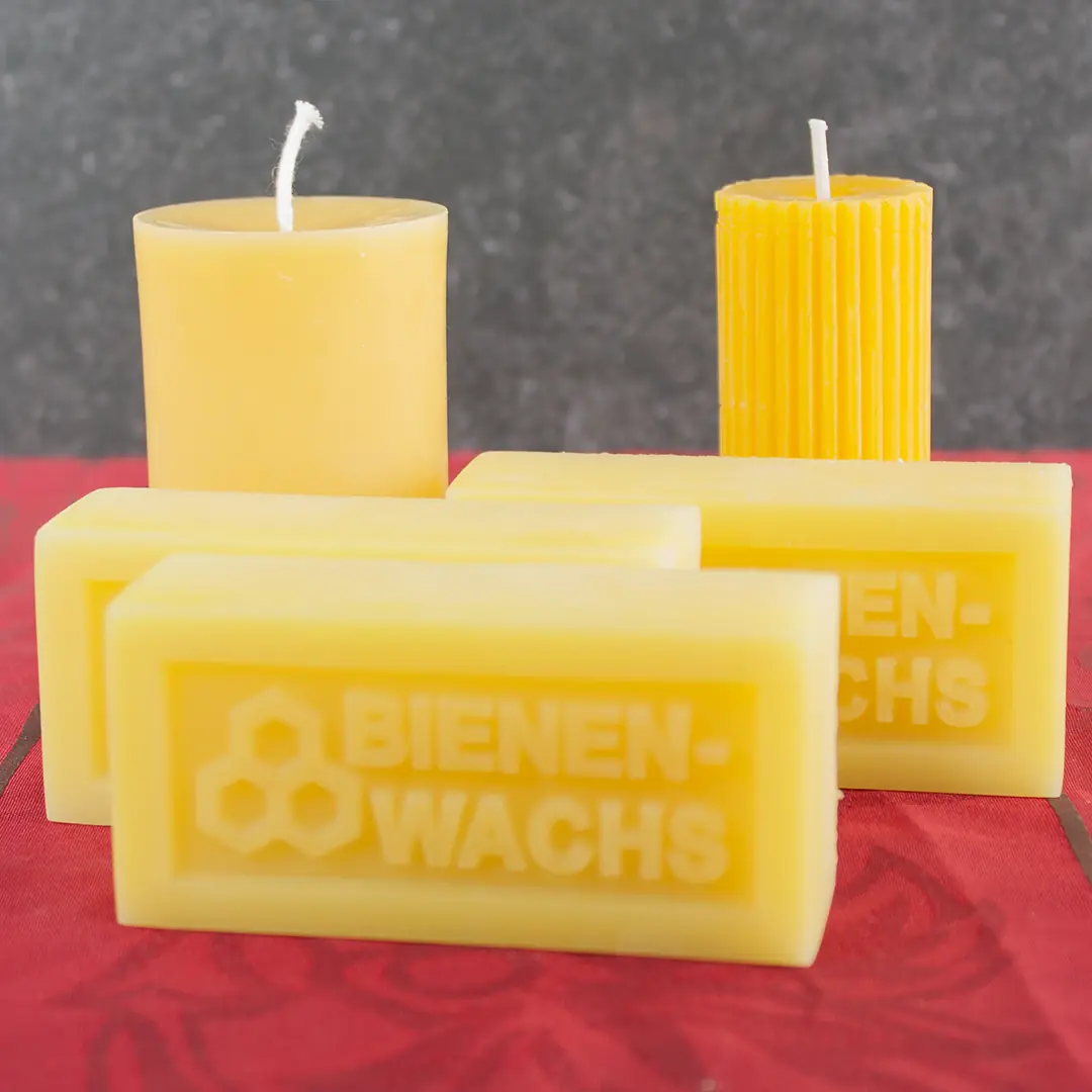 Für Imker ist Bienenwachs ein wertvolles Nebenprodukt der Honigproduktion. Wenn wir alte oder überschüssige Waben erneuern, sammeln wir das Wachs, schmelzen es ein und reinigen es sorgfältig. Aus diesem goldgelben Rohstoff entstehen dann unsere handgefertigten Kerzen.